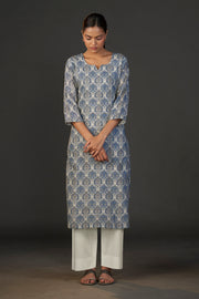 Pure Linen Cotton Digital Ptd Kurti Blue Cream Grey