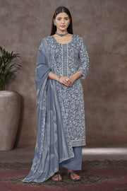Jaam Satin Digital Prints Yock Daman Embroidery Work Salwar Kameez In Light Gray Color